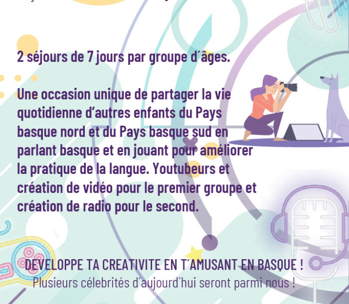 -Un séjour du 17 au 23 juillet pour les 9/12 ans autour de la thématique de la radio en langue basque (21 places pour les jeunes du Pays basque nord et 27 pour les jeunes de la Communauté Autonome d'Euskadi).